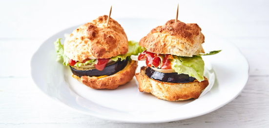 Egy mérőpohár KetoMix zsemle por keveréket keverjen össze vízzel. A kész tésztából formázzon gombócokat. Adjon hozzá köményt és sót. Süsse sütőpapírral bélelt tepsiben 20 percet 170 °C-on. Egy serpenyőben forrósítson fel egy csepp olajat. A padlizsánt és hagymát vágja szeletekre és párolja mega z olajon. A megsütött zsemléket kenje meg mustárral, tegye rá a padlizsánt és a hagymát. Fogpiszkálóval átszúrva tálalja.