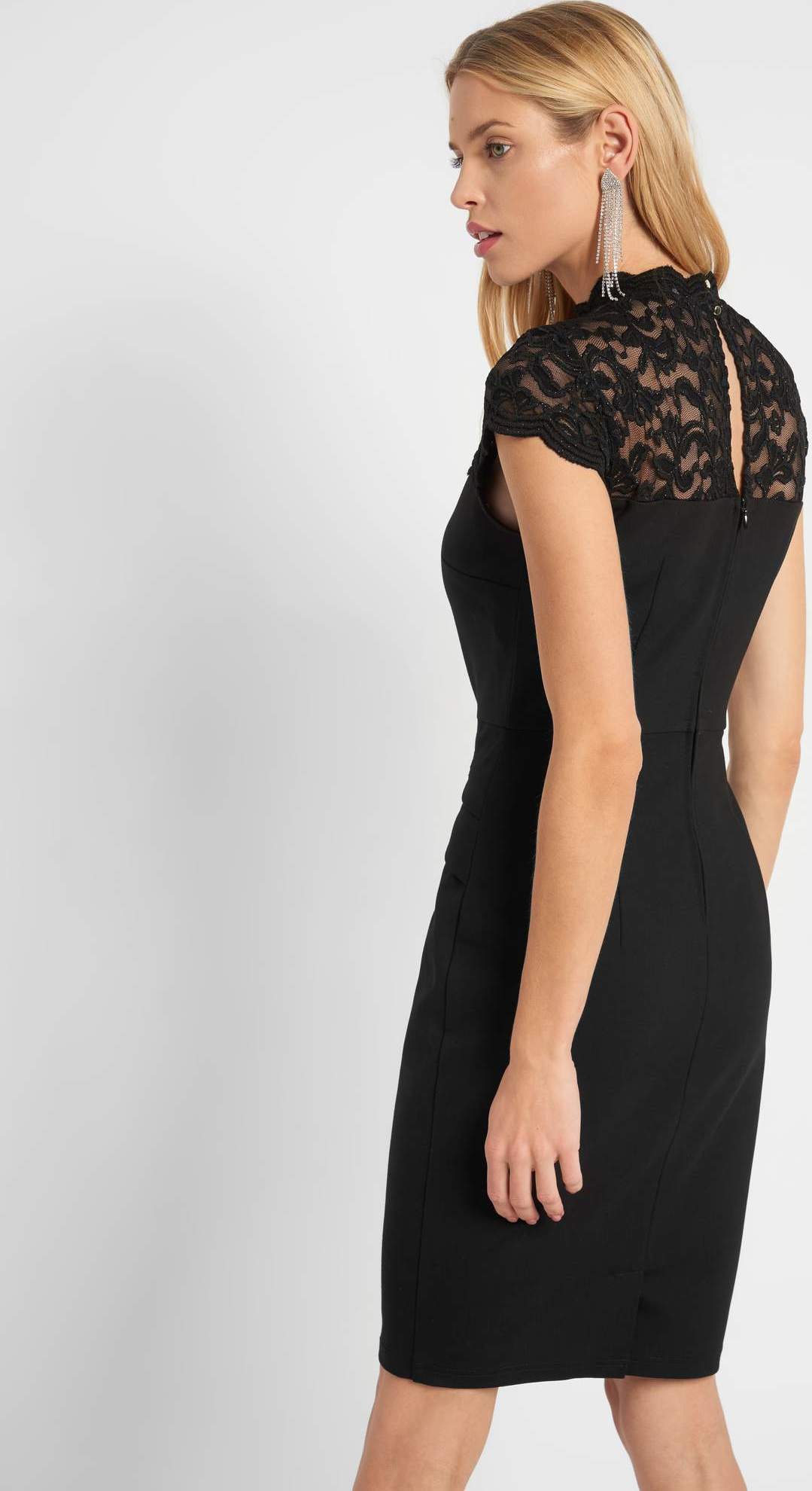 Alakra alakra szabott ruha, csipkés állónyak, rövid ujjak, derékrészen bevett, alul sliccelt, hátul gombolós hasíték, ugyancsak hátul rejtett cipzár, a felsőrész enyhén áttetsző csipkéből készült, a többi vastagabb szövet A fényképen látható modell 178 cm magas és 36-os méretet visel. A 36-os méretű termék teljes hossza: 97,4 cm.