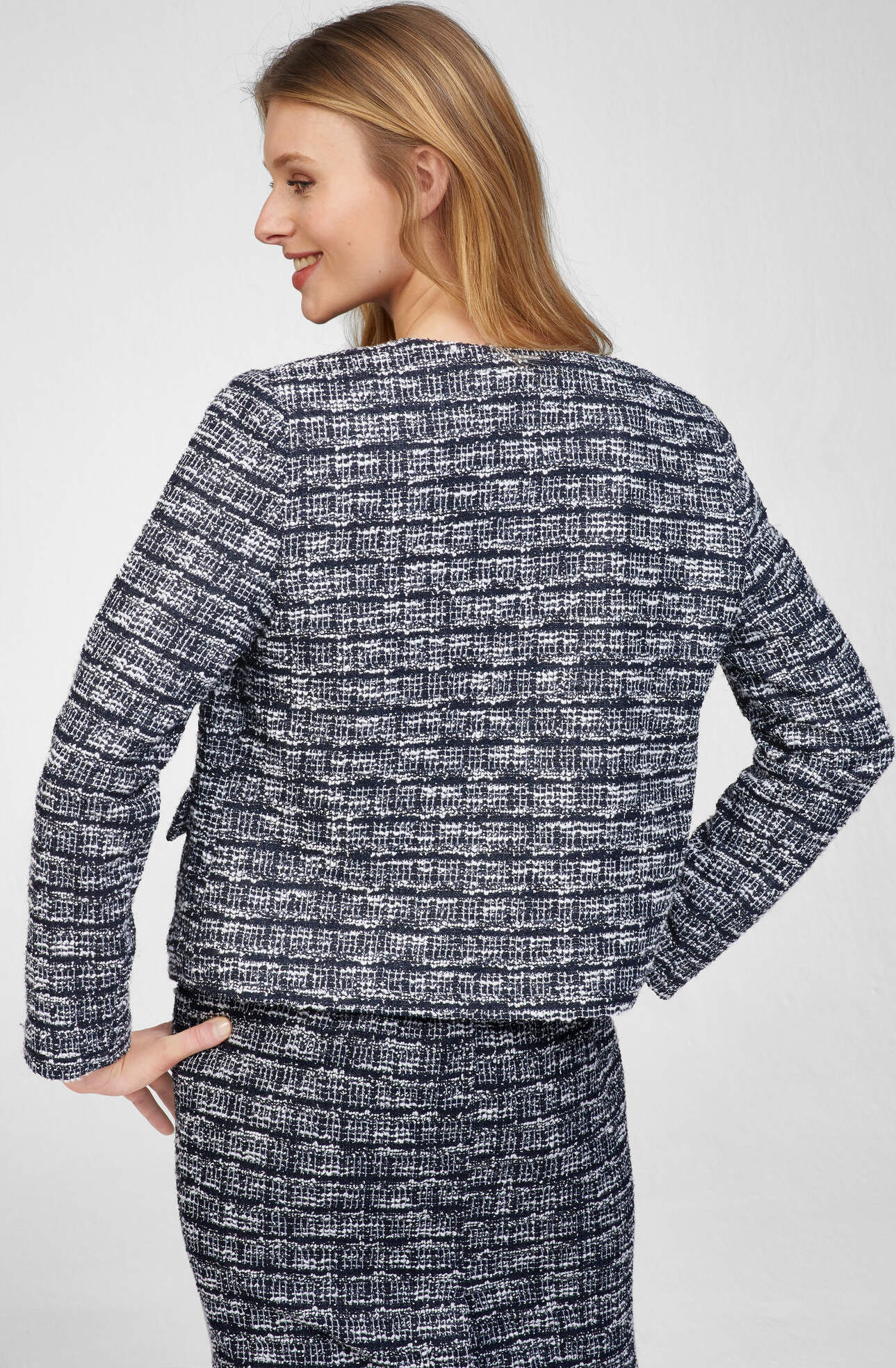 Dobozszerű, dobozszerű, egyszerű női blézer, kockás minta, kerek nyakkivágás, hosszú ujjak, párnázott vállak, elöl kapcsos rögzítés, két, hajtókás zseb, vastag, tweed pamut szövetből készült, a bélés puha szövet A fényképen látható modell xxx cm magas és 38-as méretet visel.