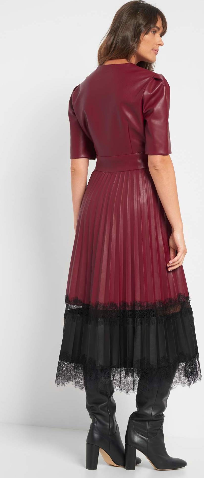 Különleges különleges midi ruha, átlapolt V-nyak, rövid, bő ujjak, integrált öv, oldalt rejtett cipzár, pliszírozott harangszoknya, alul csipkés panel, puha öko bőrből készült A fényképen látható modell 175 cm magas és 38-as méretet visel. A 36-os méretű termék teljes hossza: 119,4 cm.