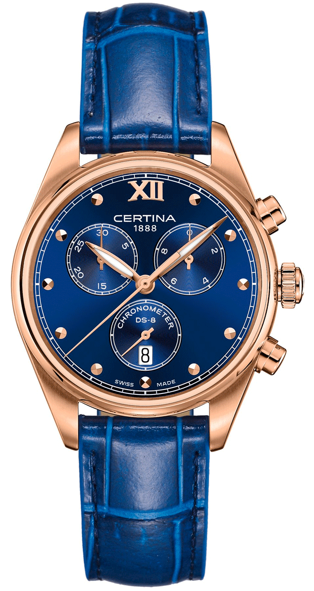 Márka: CERTINA | Kollekció: DS 8 | Modell: 0332343604800 | Garancia: 2 évek | Szín: kék | Tok színe: rózsaarany | Tok anyaga: nemesacél | Táplálás: elem | Szíj anyaga: bőr | Funkciók: COSC tanúsítvány | Funkciók: Dátum – a hónap napja | Funkciók: DoubleSecurity DS rendszer | Funkciók: Stopper 1/1 másodperc – 30 perc | Vízálloság: 100M/10ATM | Üveg: zafír | Forma: kerek | Csatolás típusa: Pillangózár | Rendeltetés: női | Minimális kerület: 15 | Termék típusa: karórák | Típus: analóg | Maximális kerület: 19 | Szíj szélessége: 17-14 mm | Átmérő: 35 mm | Vastagság: 10 mm