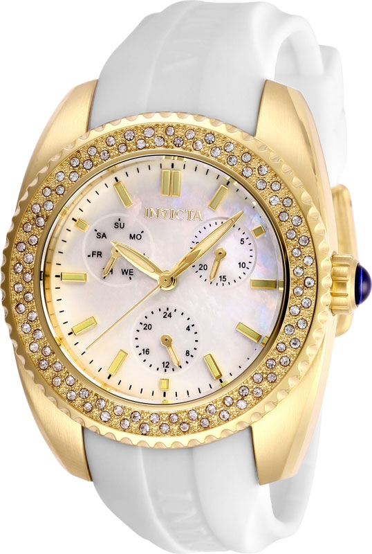 Márka: INVICTA | Kollekció: Angel | Modell: 28488 | Garancia: 2 évek | Szín: fehér | Tok színe: arany árnyalat | Tok anyaga: nemesacél | Táplálás: elem | Szíj anyaga: műanyag | Funkciók: 24-órás számlap | Funkciók: Dátum – a hónap napja | Funkciók: Dátum – a hét napja | Vízálloság: 100M/10ATM | Üveg: flame fussion | Forma: kerek | Csatolás típusa: standard felcsatolás | Számjegyek a számlapon: indexek | Rendeltetés: női | Minimális kerület: 15 | Termék típusa: karórák | Típus: analóg | Maximális kerület: 20 | Szíj szélessége: 20-18 | Átmérő: 38 | Vastagság: 12