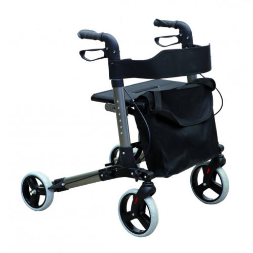 Ez az összecsukható exkluzív rollátor kerekekkel van felszerelve, éppen ezért nem kell megemelni. Előretolás után a kézzel működtetett féket (mindkét oldalon) behúzva, stabilan rá lehet támaszkodni, ráülni. Bizonyos súlyhatárig táska vagy bevásárló szatyor is akasztható rá, így megkönnyíti a mindennapokat, de a nagy táska elől is rengeteg mindent képes elrejteni. A kosárként használható fedeles táskája és ülése levehető. Mivel összecsukható és nagyon könnyű, így egyszerű tárolni vagy bárhová elvinni, a kerekek egyszerű lehúzásával akár több hely is nyerhető. Fontos, hogy a testmagassághoz megfelelő eszközmagasságot állítsunk be. Amennyiben nem tudjuk megítélni, hogy mi a megfelelő magasság számunkra, kérjük szakember (gyógytornász, gyógyászati segédeszköz eladó) segítségét az első beállításkor.